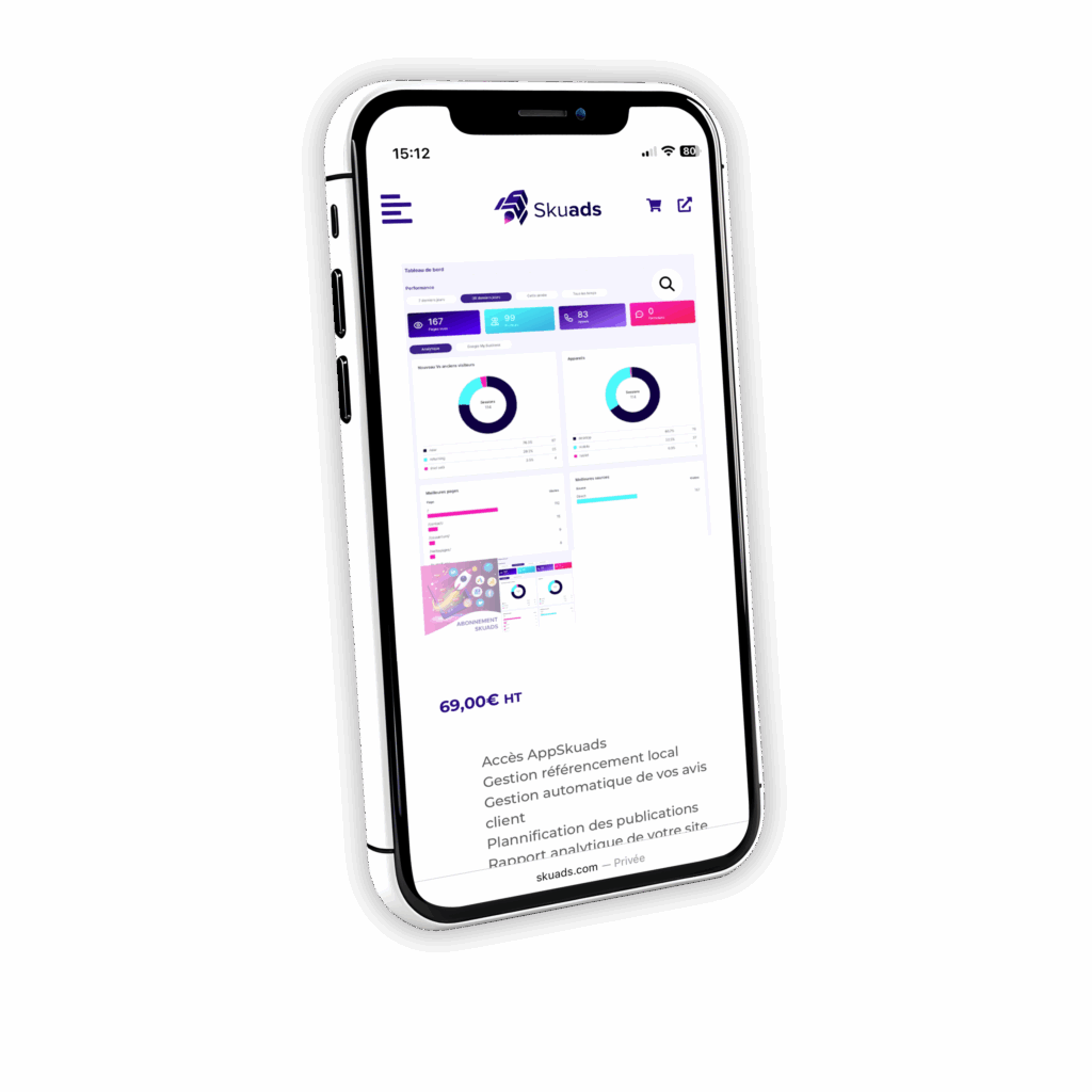 Pour te faire avancer sereinement on a développé l’App Skuads, une plateforme unique  tout-en-un qui centralise tes outils de suivi et de création marketing : résultats, appels, gestion des outils Google, suivi des campagnes, leads, générateur IA et bien plus encore !